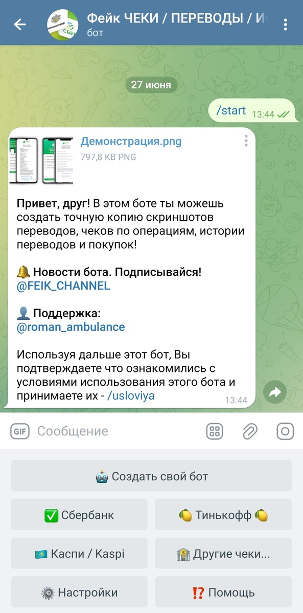 PerevodCheck - Этот бот существует для помощи людям в создании фейковых чеков или скриншотов переводов с разными суммами, получателем, отправителем и т.д. Зачем вам это нужно? Чтобы пранкануть друга или чтобы подшутить над мошенником, который ждёт, что вы переведете ему свои деньги? Боту это абсолютно неважно Он без лишних вопросов сделает нужный чек. Не нужно быть гением, чтобы интуитивно догадаться, как работать с данным инструментом. Готово! ССЫЛКА НА БОТА В ТЕЛЕГРАМ👇👇