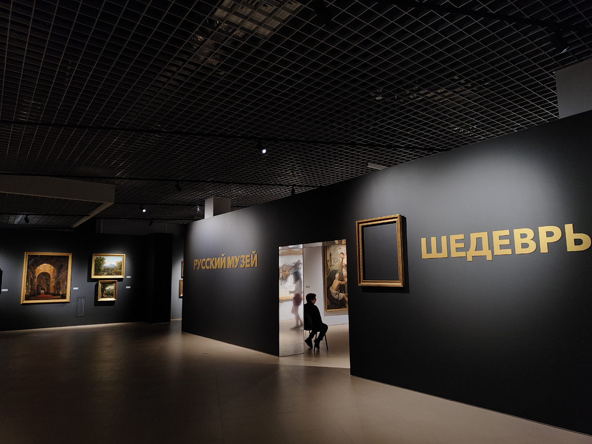 Завершить обзор выставки мы бы хотели обсуждением эргономики пространства: заходим в зал - сразу же сбоку висит огромное полотно, которое из-за близости к двери едва ли удастся нормально рассмотреть (речь о постоянном потоке людей). Также важно отметить узкие проходы в зале авангарда и русской иконописи: казалось, что смотрители изрядно нервничали, когда пять и более человек пытались протиснуться между двух стен застройки. Ну и отдельной болью стало помещение небольшой работы Василия Верещагина "Колоннада в джайнском храме на горе Абу" (1874-1876) так же вплотную к выходу из зала. Да, работа действительно небольшая, но рама заслуживает отдельного внимания и как бы является продолжением интерьера храма: живопись выходить за пределы плоскости и будто вовлекает зрителя в коридор из узорчатых колонн. Во время посещения выставки рекомендуем вам обратить внимание не только на действительно выдающиеся размером и именем полотна, но и на этот, не побоимся сказать, объект.