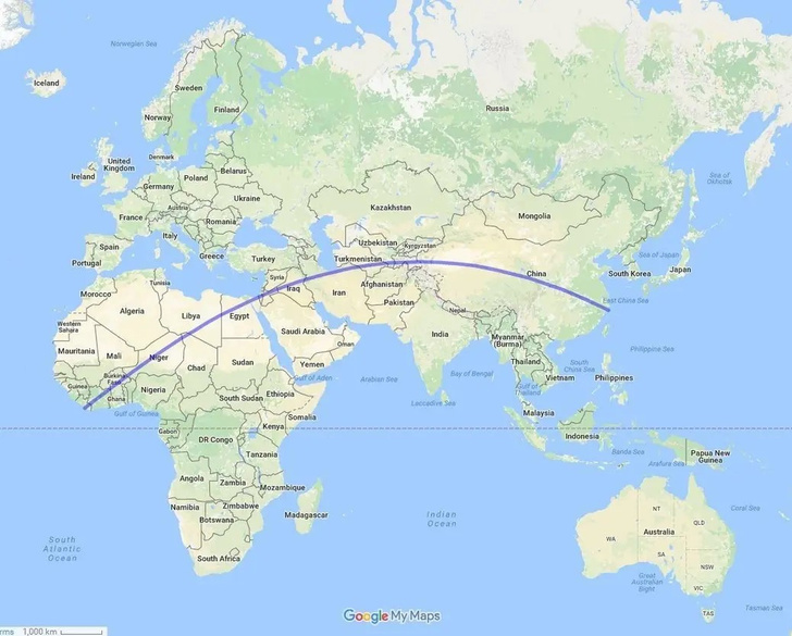 Искривление маршрута на карте связано с тем, что Земля имеет форму шара. Из-за особенностей проекции Меркатора, которая используется для создания карт, прогулка по ширине России будет казаться короче, чем она есть на самом деле.
