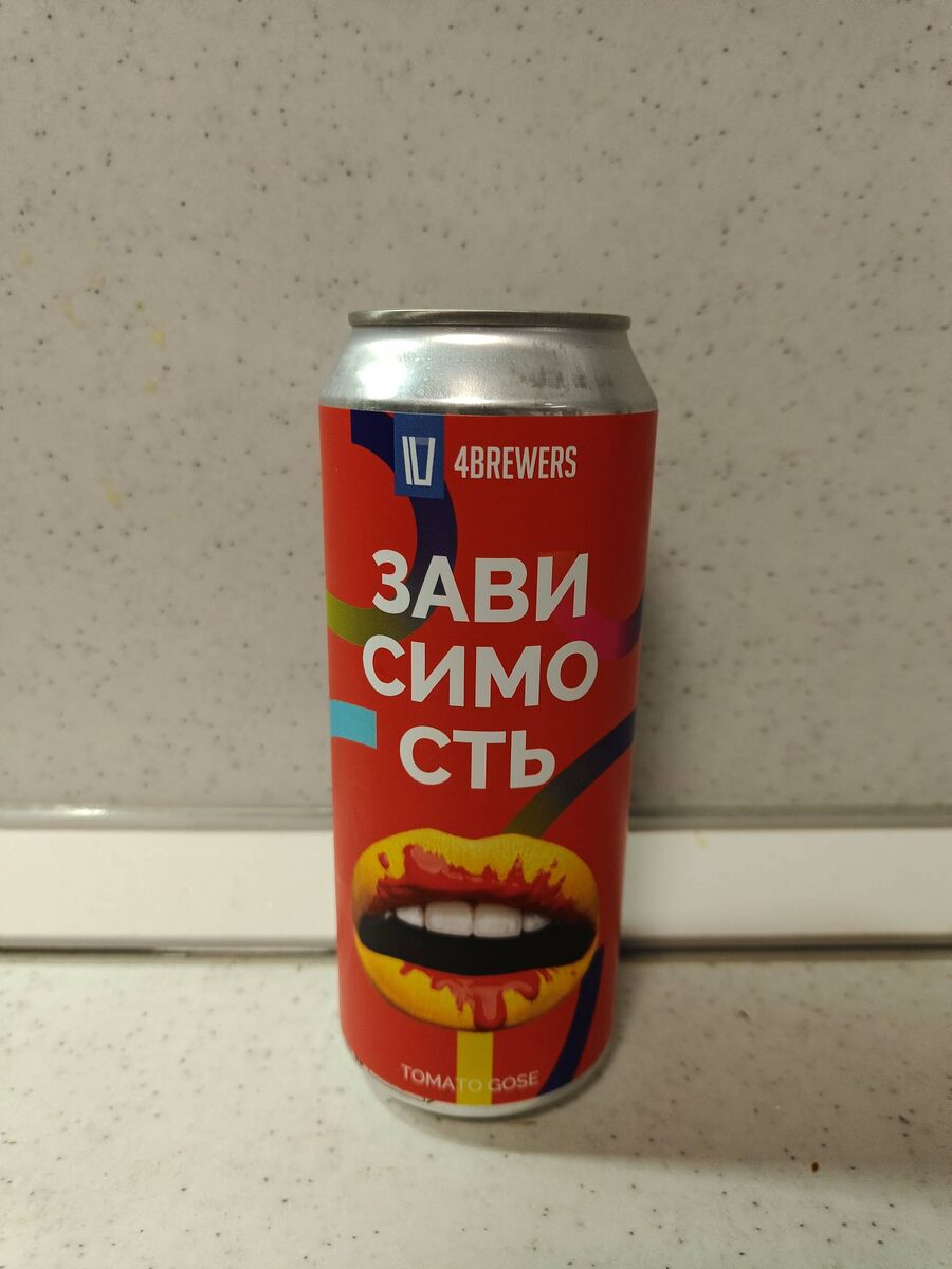 Я очень люблю томатный сок и пиво. Почему бы не объединить эти два напитка?) Это второе томатное пиво в моей жизни. Первое я пробовал Tomato Motato от пивоварни Таркос. Мне оно совсем не понравилось, водянистое, вкуса томата мало и очень соленое будто пьешь рассол. Друзья посоветовали попробовать Зависимость от 4brewers. Я взял обычное томатное гозе, но в линейке у пивоварни много сортов томатного пива. Стоит отметить максимально яркий стильный и вкусный дизайн банки. Обращает на себя внимание и заставляет купить). Состав: вода питьевая, солод пивоваренный ячменный, томатная паста (томат), лактоза, соль поваренная пищевая, базилик, парика, кориандр, хмель прессованный, дрожжи пивные, сорбат калия (Е202). Стиль: томатный гозе; Объем: 0,5 дм3 (да именно так указано на банке); Плотность: 12,5%; Алкоголь: 5%; Изготовитель: ООО "Четыре пивовара", г. Владимир; Цена: 303 рублей. На банке производитель нам оставил такое послание: "От одной дозы ничего не будет. Смело наливайте бокал. Вряд л