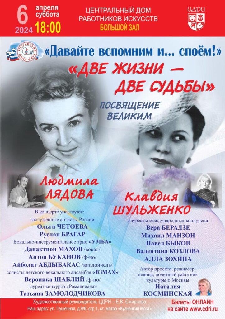 06.04.24 в посвящение советскому и российскому композитору, пианистке, певице, народной артистке РСФСР Людмиле Лядовой и русской советской эстрадной певице, актрисе, народнрй артистке СССР Клавдии Шульженко в большом зале Центрального дома работников искусств был дан концерт «Давайте вспомним… и споём» «Две жизни – две судьбы», в котором принял участие и академик ИАСК заслуженный артист России Брагар Руслан Генриевич.