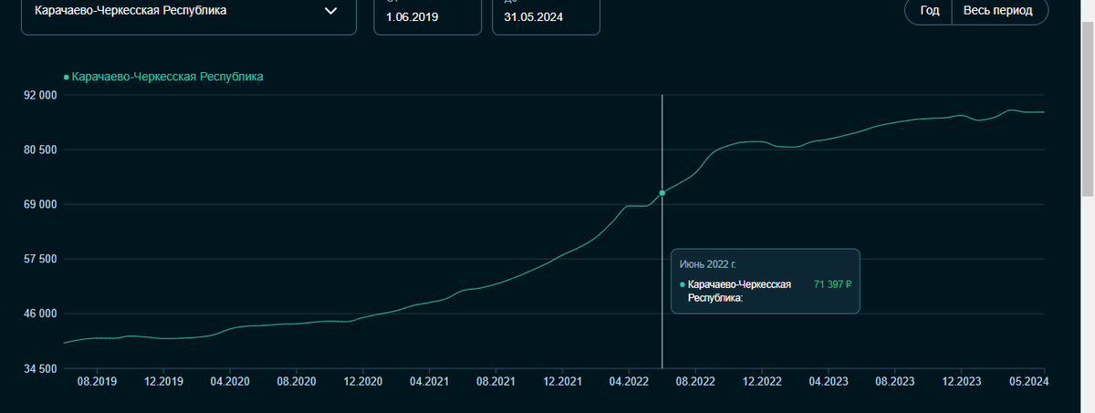 Юг (Карачаево-Черкессия и Кавминводы) Нерезин.... ой, Моква Инфляция Росстата за этот же период Москва за 5 лет: рост с 174 тыр/квадрат до 286, рост за 5 лет составил 64%. Очищаем от инфляции, получаем реальный рост 22% за 5 лет. Грубо 4% в год. Не спешите радоваться. Если взять временной интервал побольше, с 2016го, то реальный рост за 8 лет составил 20%, - в период 2015-2019 цены стагнировали, а то и проседали, но и инфляция была минимальна. Грубо 2,5% в год. С учётом расходов на один косметический ремонт и текущий ремонт розеток/выключателей, водопроводных кранов и прочисток канализации - выходим практически в НОЛЬ. Пятигорск: с 40 до 94, рост на 135%, с учётом инфляции реальный рост составил 93%. Черкесск: с 39 до 88, рост 126%, с учётом инфляции - 84%. В 2016-2019гг на Юге был такой же боковик в ценах на жилую недвижимость, как и в Первопрестольной. Доходность ЖН с 2016 по 2024 мы посчитали неправильно: от низа ценовой волны до её вершины. Но за приливом - всегда отлив, это неиз