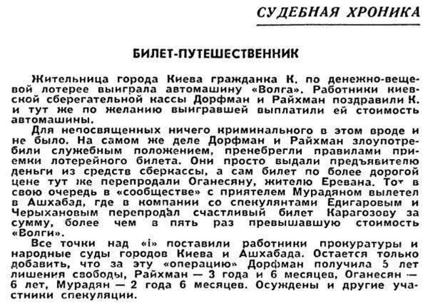 Как видите из прикреплённой к статье заметки в советской газете, за продажу лотерейного билета банковских работников посадили в тюрьму на реальные сроки: строгое наказание, если учесть, что порядки в советских тюрьмах были сравнительно суровыми. Из 2024 ситуация выглядит странной, однако, если разобраться, всё логично и даже (по логике развитого социализма) справедливо.
