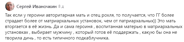 В обсуждениях к предыдущему тексту подняли тему женского доминирования в семье. Якобы, если мать третирует свою дочь, то виноваты в этом не патриархальные установки, а матриархальные. Ах, если бы, ах, если бы. А теперь отвлечемся от фантазий известного комментатора и окунемся в реалии патриархата. Несмотря на то, что в предыдущем тексте речь шла про Южную Корею, механизмы его влияния на других территориях те же. В патриархальной семье фактической главой семьи действительно может быть мать. Но и объяснение этому имеется. Все потому, что мужчина — добытчик и главный по финансам в семье. Женщина же выполняет роль хранительницы очага. Т.е. принимает решения, касающиеся дома. Это и вся бытовуха, и воспитание. Муж, каким бы подкаблучником он ни был, в домашних делах не участвует, и потому его влияние на членов семьи весьма опосредовано. Кто он такой, чтобы давать советы своим детям или критиковать жену? Он тупо не разбирается во всех этих женских «хотелках». Поэтому, да, мать может воспитыва