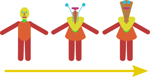 Расположение мозга в наших головах — это примитивная черта, унаследованная напрямую от первых «еще не-позвоночных», которые ползали в грязи задолго до того, как даже растения выбрались из воды. Вы не можете просто так это изменить. Скорее всего, чтобы переместить мозг из головы в грудь, вся голова должна была бы сместиться вниз и слиться с грудью в одну структуру: затем органы чувств и ротовая полость должны были бы вытянуться еще выше и слиться в новую «ложную голову». Гомологичные части выделены тем же цветом: