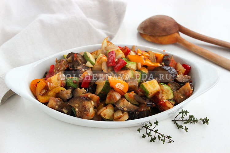 Овощное блюдо французской (прованской) кухни под названием рататуй готовят в духовке, нарезая кабачки, баклажаны, перец и помидоры тонкими слайсами. Или готовят по-быстрому — в сковороде на плите. Этот вариант ближе к простой деревенской кухне. Точную пограммовку я не делала, так как она в этом рецепте не нужна. Вы можете взять больше кабачков, баклажанов или перца, что вам больше нравится и найдется в холодильнике. Чеснока не жалейте. И обязательно добавляйте сухой тимьян, он превратит привычное для нас овощное соте в классический французский рататуй. Совет! По этому рецепту рататуй будет острым. Вы можете регулировать остроту на свой вкус, но перец чили должен присутствовать, не убирайте его из списка ингредиентов, иначе вкус будет совершенно другим. У баклажана срезать кончики, поцарапать кожицу вилкой. Нарезать кубиками примерно 1,5 см. Засыпать их солью (пару щепоток) и оставить минут на 10 , чтобы влага вышла. Тем временем приготовить соус. Несколько помидоров натереть на крупной