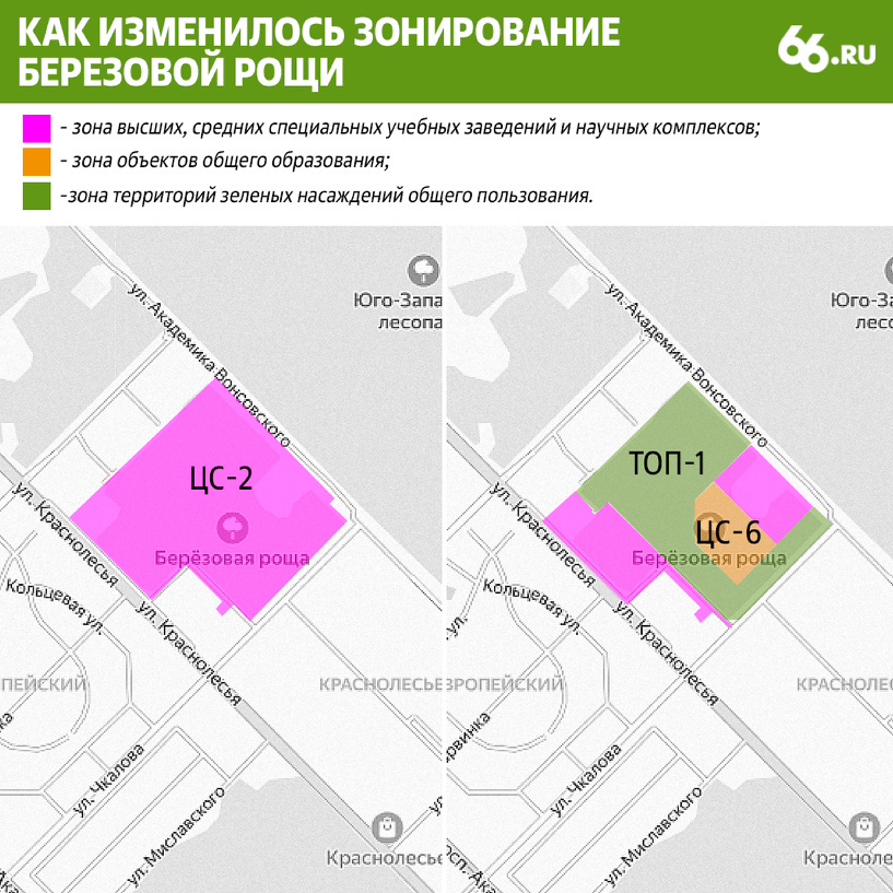 Зеленый участок в квадрате Вонсовского — Мехренцева — Чкалова — Краснолесья перевели из зоны объектов среднего, высшего профессионального образования и научных комплексов в статус «территории общего пользования» (парки, набережные, скверы, бульвары). Такое решение приняли на заседании комиссии по подготовке проекта правил землепользования и застройки. Также небольшой участок площадью 3,5 гектара перевели в зону объектов общего образования. Здесь построят школу. «Ситуация с Березовой рощей показала, что только при разумном диалоге с городскими властями можно добиться благоприятного решения для горожан», — уточнил глава фракции «Единой России» в гордуме и руководитель свердловского отделения Российского экологического общества Алексей Вихарев. При этом для «Атомстройкомплекса» ничего особо не изменилось. От возможной застройки защитили только саму рощу. Но девелопер и не собирался там строить. Главная новость по теме В пресс-службе «Атомстройкомплекса» корреспонденту 66.RU уточнили, что