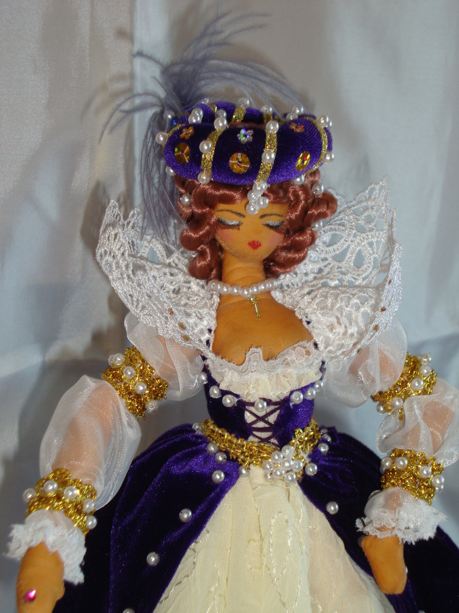 Давно хотела сделать куклу в костюме дамы эпохи Возрождения, и вот, наконец-то, сделала! Это - текстильная интерьерная кукла, высотой около 30 см, стоит на подставочке. Она вся в шелках, бархате и жемчуге, с модным в те времена тюрбаном на голове. Мне нравится делать кукол с полуприкрытыми глазами и опущенными вниз ресницами - это создаёт таинственный образ, кроме того, я не люблю "пристальный и неморгающий" взгляд у кукол (но это моё мнение). Итак, моя новая кукла "Дама в стиле Ренессанс":