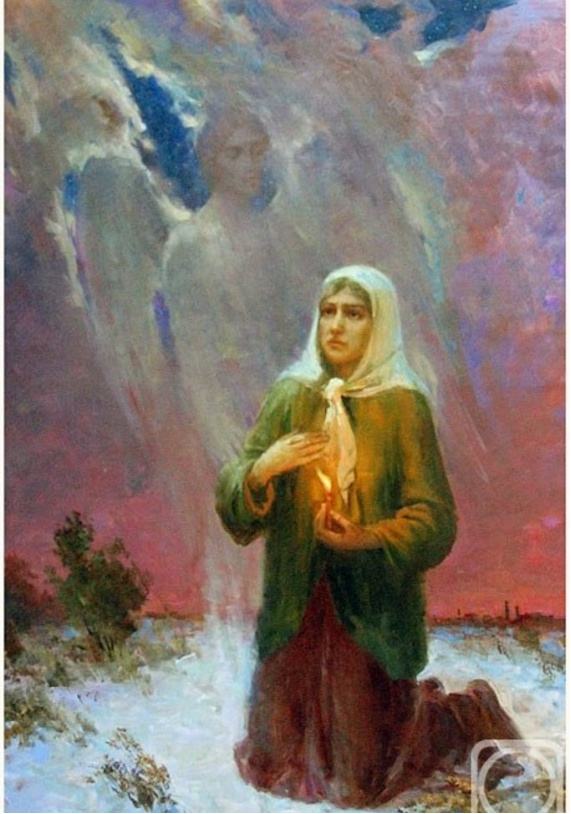 Чтоб было понятней, я представляю, как Ангел-хранитель огромными мягкими белыми крыльями обнимает его, сберегая. А Никола Спаситель держит его сзади за плечи. Христос - за руку, указывая верный путь (иногда выход к спасению). Богородицу я вижу сверху в белых одеяниях как огромную белую голубицу над всеми.