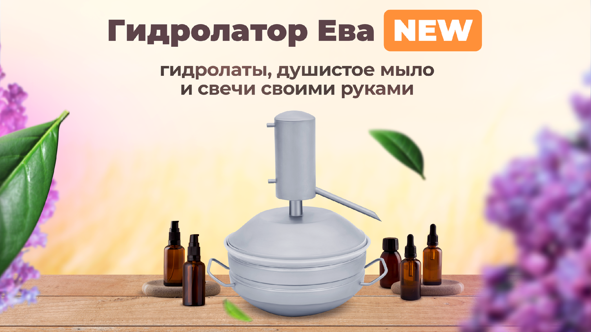 Гидролатор «Ева NEW» — доступная и эффективная модель. Приготовить с его помощью любой гидролат легко и просто. Он подходит для любых видов плит, занимает немного места, и может применяться даже на небольшой кухне. Материал — пищевая нержавеющая сталь. У новой модели улучшенное соединение бака и крышки, это удобная стыковка деталей и никакого выхода пара. Чтобы увеличить объём выкладываемых растений, мы добавили дополнительную зиговку (теперь их две). Можно устанавливать один или два поддона с растениями для необходимой насыщенности гидролата.