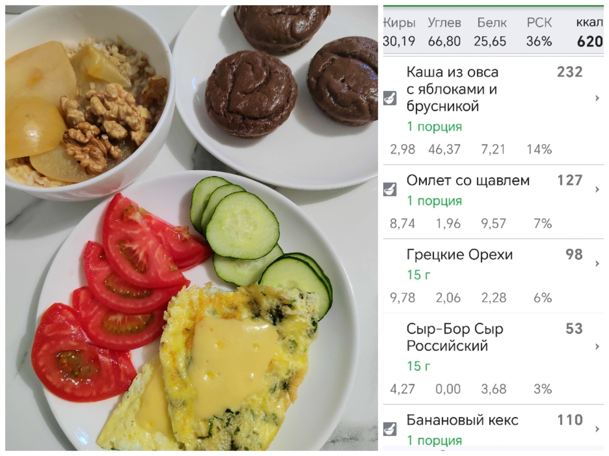 Сегодня на завтрак каша из цельного овса (40гр) с яблоком и орехами, омлет из одного яйца с сыром, 1 бананово-овсяный кекс с какао. Тесто для кексов: 2 банана 2 ст. ложки овсяной муки 2 ст. ложки какао порошка 1 яйцо 20 гр растопленного сливочного масла 5 гр разрыхлителя. Все смешать, выпекать в форме для кексов 25-30 мин при температуре 180 градусов. Из такого количества теста получаются 6 кесиков по 63 гр и 110 ккал.