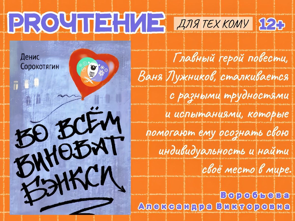 🙋🏻♀️ Традиционная авторская колонка от методиста нашей школы, журналиста с многолетним стажем, Александры Викторовны Воробьевой https://vk.com/sanechka78. ✨ Все началось с гаража. С зеленого гаража где-то на улочках старой Москвы. Повезло же главному герою, что гараж был зеленым! Наверное, поэтому она его и выбрала… ⛔️ Но стоп! Без спойлеров! Итак, у нас есть гараж, вернее, зеленый гараж – это раз. Есть мальчик, так сказать, хозяин гаража – это два. Этот блондин в клетчатой рубашке – Ваня Лужников, которому четырнадцать. 👨🏻🎓 Он простой парень, хорошо учится в школе. На дворе лето, каникулы, свобода! И вот в один из таких летних дней на зеленом семейном гараже кто-то оставляет надпись, сделанную красным баллончиком… 🎨 Так в жизнь Вани входит стрит-арт. Ему предстоит окунуться в этот мир и столкнуться с парнем по прозвищу Кулек, а еще встретить Тусю, девочку с зелеными волосами, которая без ума от Бэнкси, пишет ему письма и мечтает оказаться в Лондоне. 🖌️ Декорации р