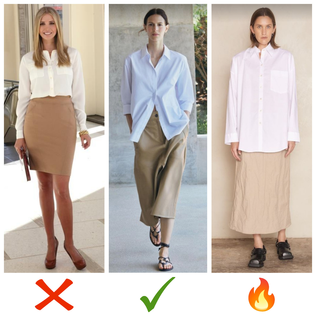 ❌Устарело: Сегодня такая длина юбки с облеганием, прилегающая блузка и туфли с подносочной платформой относятся к устаревшим вещам и создадут несовременный образ. Обратите внимание на воротник блузки и материал, который не держит форму. Накладные карманы в этом случае также добавят вещи возраста.