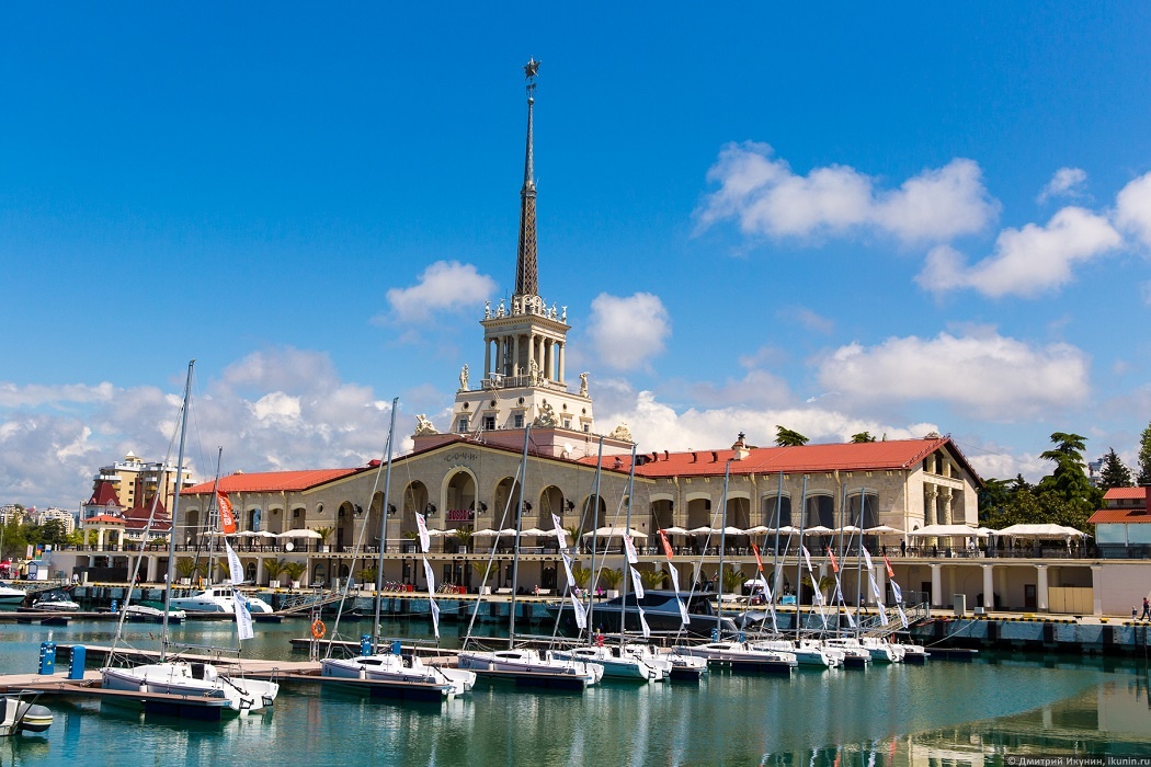 Визитная карточка Сочи - это Морской вокзал. Отсюда в пляжный сезон теплоходы ежедневно возят туристов в море посмотреть на дельфинов и полюбоваться побережьем. Кстати, именно здесь снимали сцену прощания с семьей Семена Семеновича Горбункова в "Бриллиантовой руке".