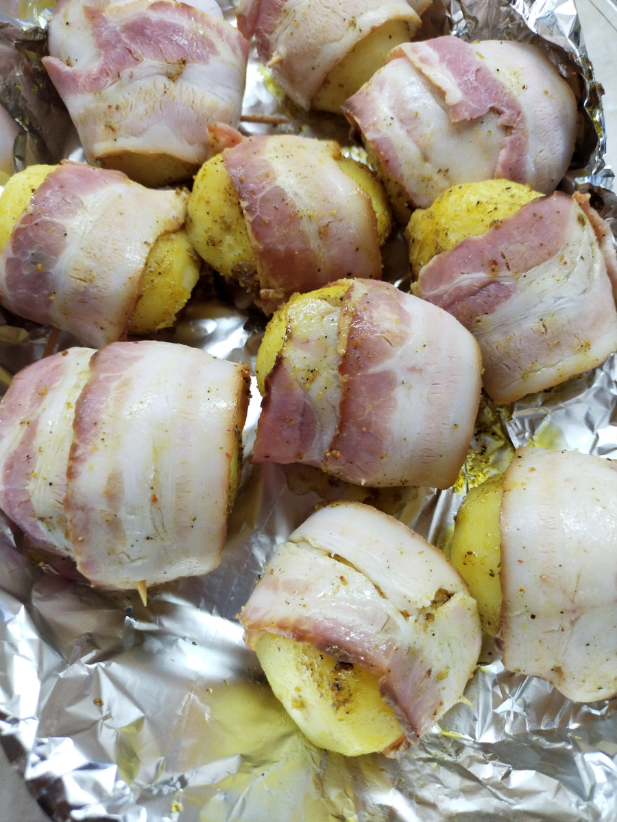 Иногда... ай, кого я обманываю! Часто, часто мне снятся яркие реалистичные сны. Вот и опять: приснилась картошка, обмотанная беконом. Или салом - я не поняла, нос и во сне не работает. :) И так это было здорово, что я поняла, какой будет ужин для дачника-мужа. Как в воду глядела: решила замочить зубочистки. Это чтобы никаких неожиданностей в духовке не случилось. Положила их в воду, а сверху стакан поставила, чтобы не всплыли. Теперь надо воду вскипятить. С солью. Я сразу соль кладу, а то вдруг забуду! Картошку станем отваривать! Картошечка маленькая, новая, практически калиброванная! Одна была крупнее других, да по счастью оказалась зелёной. Я срезала зелень - заодно и размерчик подправила. :) Почему картошку в кипящую воду? А так вкуснее: крахмал сразу запечатается, вкус будет насыщеннее, не водянистый. Опустили - и варим. До готовности варим, чтобы уж наверняка! Тем временем подготовим секретную смесь. Никому не скажу, что в моей секретной смеси - чёрный и красный перец, сухой чесно