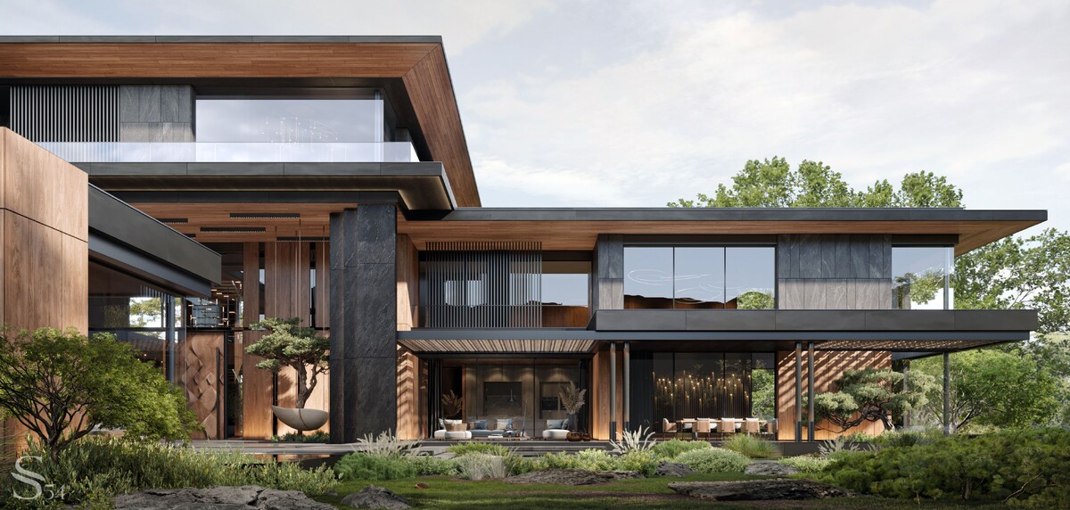 Представляем проект загородного дома площадью 1408 м² в Узбекистане, созданный студией Studia 54. Вдохновленный нашим портфолио проекта в Калининграде, заказчик обратился к нам с желанием получить дом своей мечты. Мы разработали как архитектуру, так и дизайн интерьера, что позволило создать цельную концепцию, где каждая деталь дополняет другую. Локация: Узбекистан, коттеджный городок DIAMOND VILLA Площадь: 1408 м² Нашему заказчику было важно создать вид на горный пейзаж из мастер-спальни, вдохнуть в дом дух природы и изыска. Для этого мы реализовали сложную планировку и использовали материалы, подходящие для субтропического климата. В проекте террас, остекления и фасадов мы учитывали повышенную запыленность региона и обилие солнечного света. Отделка выполнена из искусственного дерева и керамогранита темного цвета, что придает дому элегантный и устойчивый к внешним воздействиям вид. Дом спроектирован для большой семьи с просторными личными и общими пространствами. В планировке предусмот