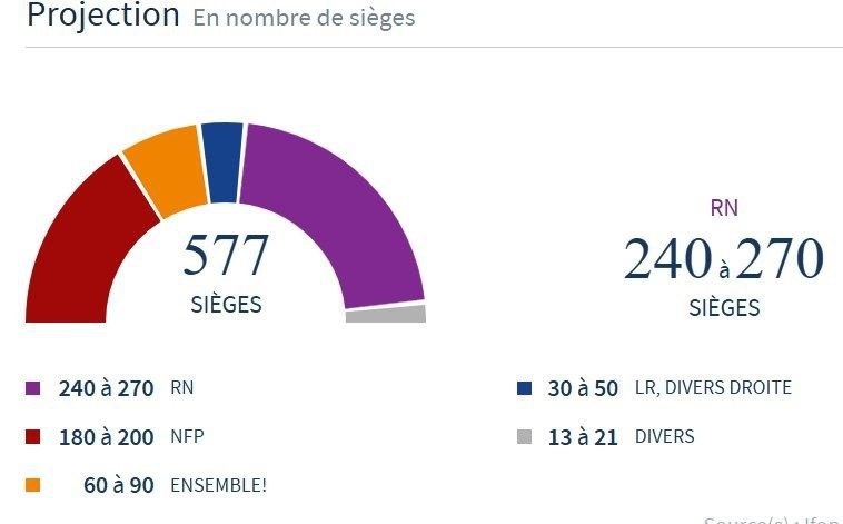 Однако левая коалиция «Новый народный фронт» (в нее входят и французские коммунисты) отстала от ультраправых всего на 1,26%, получив 27,99% голосов избирателей.