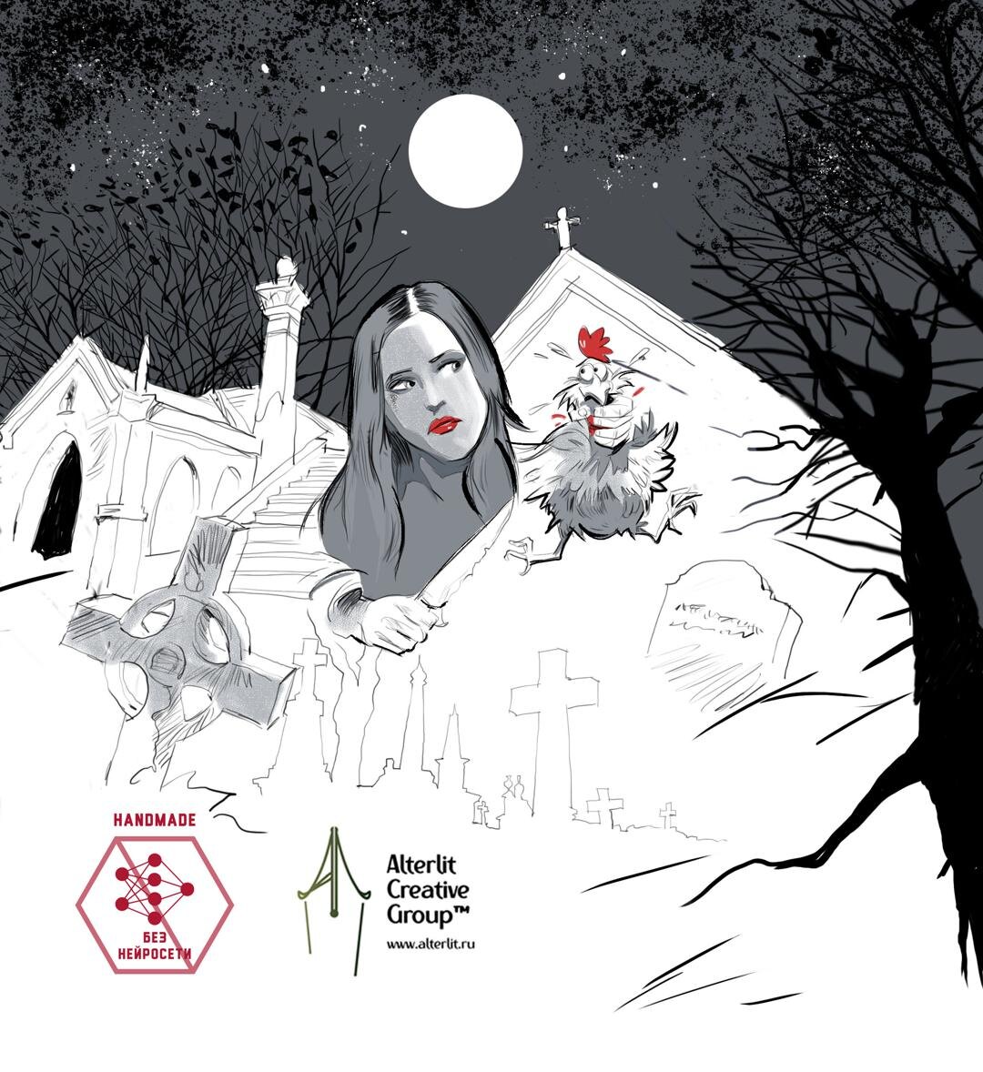 Очень много событий, описанных в буквопродукте, происходит именно на кладбище. Например, именно там героиня первого рассказа — замученная училка, стремясь наладить свою нескладную жизнь, с лёгкостью необычайной режет головы чёрным петухам.