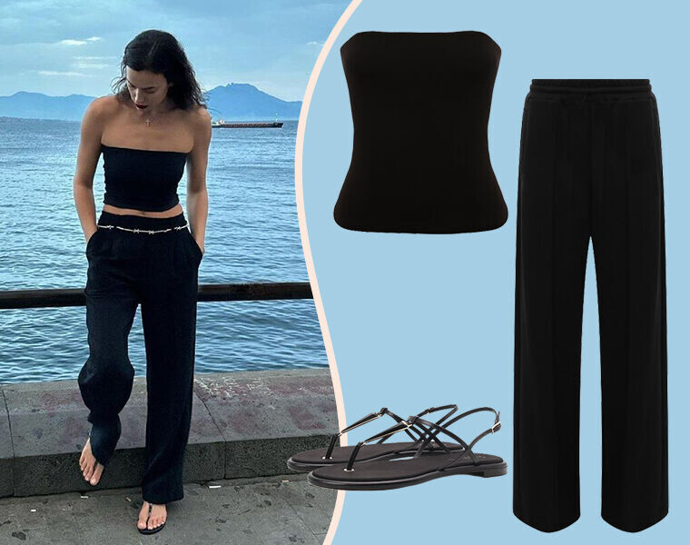 Ирина Шейк себе не изменяет и даже на обычную прогулку тщательно составляет образы, которые продуманы до мелочей. Она часто публикует в своих социальных сетях фотографии, на которых демонстрирует аутфиты для стритстайла. Ирина всегда доверяет собственному чутью, когда подбирает одежду. И получается у нее прекрасно. Она выгодно подчеркивает все свои достоинства и скрывает недостатки. На днях модель прогулялась по набережной в образе total black. Было похоже, что Шейк вдохновилась атмосферой нулевых, когда в моде были набедренные брюки и короткие топы, открывающие живот. Но при этом она отдала дань и современным тенденциям. Дива выбрала широкие черные брюки, топ-бандо в тон и оригинальные босоножки. Элегантные вьетнамки придали образу легкости. Интересной деталью стал и тонкий серебристый пояс. Дополнила образ модель небрежной мокрой укладкой и яркими губами. Ирина выбрала насыщенный вишневый цвет помады. Мы попробовали составить такой же образ, как у Ирины Шейк. И подобрать одежду для т