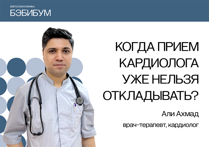 Время прочтения статьи - 3 минуты Забота о вашем сердце - забота о будущем! Как распознать тревожные сигналы от своего организма и, когда необходимо идти на прием к кардиологу, разбираем с Али Ахмадом, врачом-кардиологом, терапевтом клиники для взрослых и детей Бэбибум. Используя новейшее диагностическое оборудование и свой опыт, наши врачи собирают полный анамнез и оценивают риски. В нашей клинике можно сдать все необходимые анализы для комплексного обследования и успешного выздоровления с заботой. Сегодня сердечно-сосудистые заболевания до сих пор остаются основной причиной смертности населения нашей планеты. Заболевания сердца молодеют с каждым годом. Инфаркта миокарда, артериальная гипертензия, диссимиляция возникают у молодых людей до 35 лет. Чтобы обезопасить себя и близких, не откладывайте консультацию у врача кардиолога, если вы заметили в своем состоянии следующие симптомы: Посещать врача кардиолога регулярно 1-2 раза в год нужно тем, кто входит в группу риска: Не лишним буд