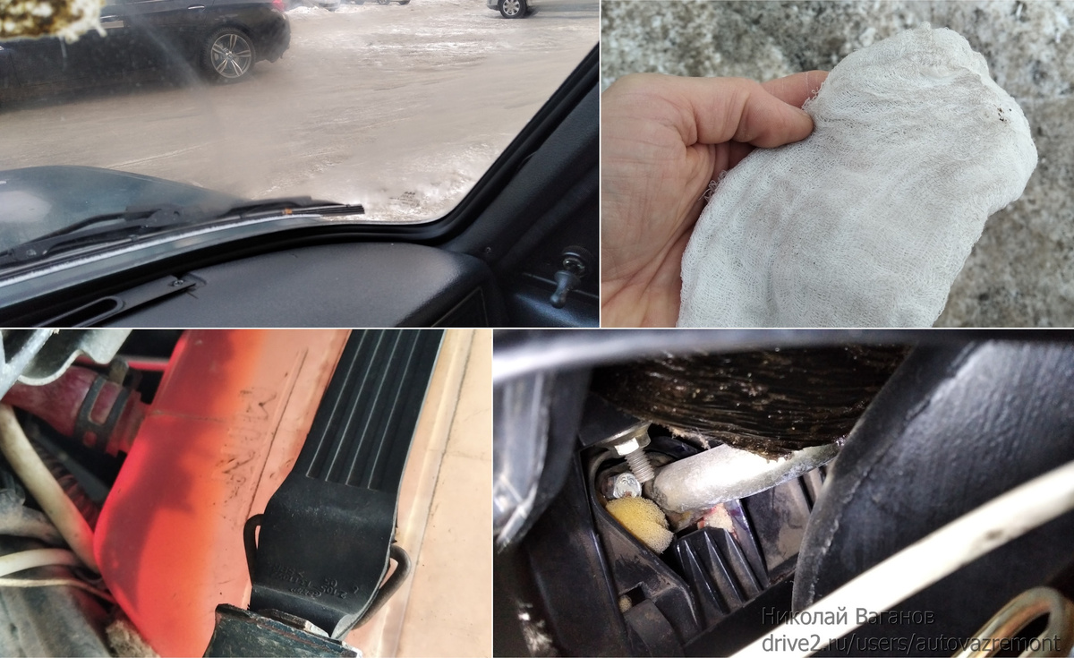 1. Где-то под Новый год начали периодически потеть стекла изнутри, появился жирноватый налет на котором оседала пыль — признак, что где-то течет антифриз, да и в бачке уровень начал немного падать. Пощупал у нижней заслонки — сухо, вынул дно бардачка и заметил, что опять течет в месте соединения трубки с радиатором. Кое-как подлез гибкой отверткой и подтянул болтики, течь вроде пропала, но через неделю-другую опять начали потеть стекла и появились подтеки на нижней засл