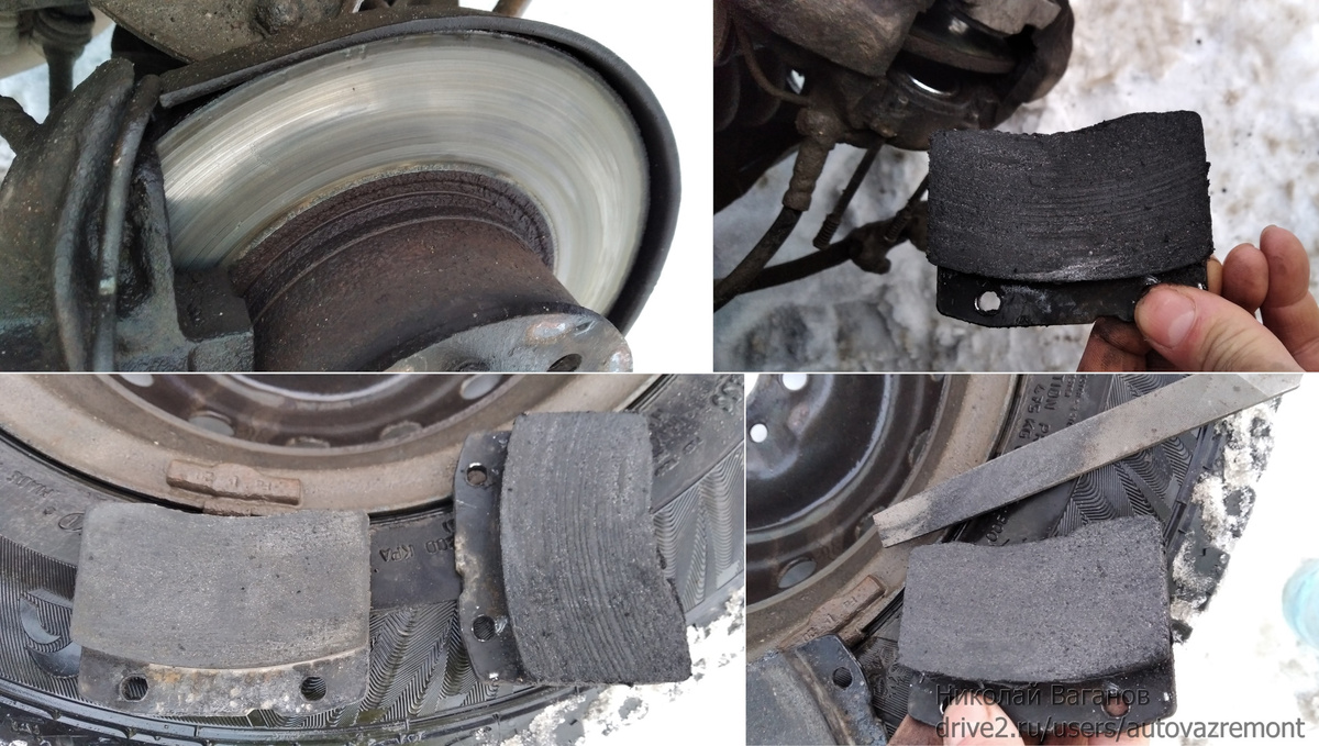 Где-то в ноябре, когда еще была грязища и слякоть при торможении машину начало уводить влево — правая внутренняя колодка оказалась в какой-то грязи и видно, что плохо прижимала, шлифанул напильником, протер, проверил поршни на закись и поставил на место — уводить перестало.