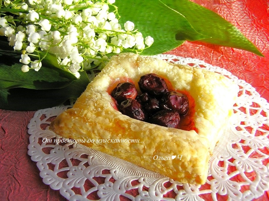 мятный сироп по вкусу Приготовление: Разморозьте слоеное тесто, разрежьте на 12 квадратов. Посыпьте сахаром, выложите в серединку несколько вишен, по желанию посыпьте корицей. Переложите заготовки на противень, застеленный бумагой для выпечки. Выпекайте при 220*С около 15-20 минут до румяного цвета. Перед подачей смажьте вишни мятным сиропом. Приятного аппетита! Вам также могут понравиться: