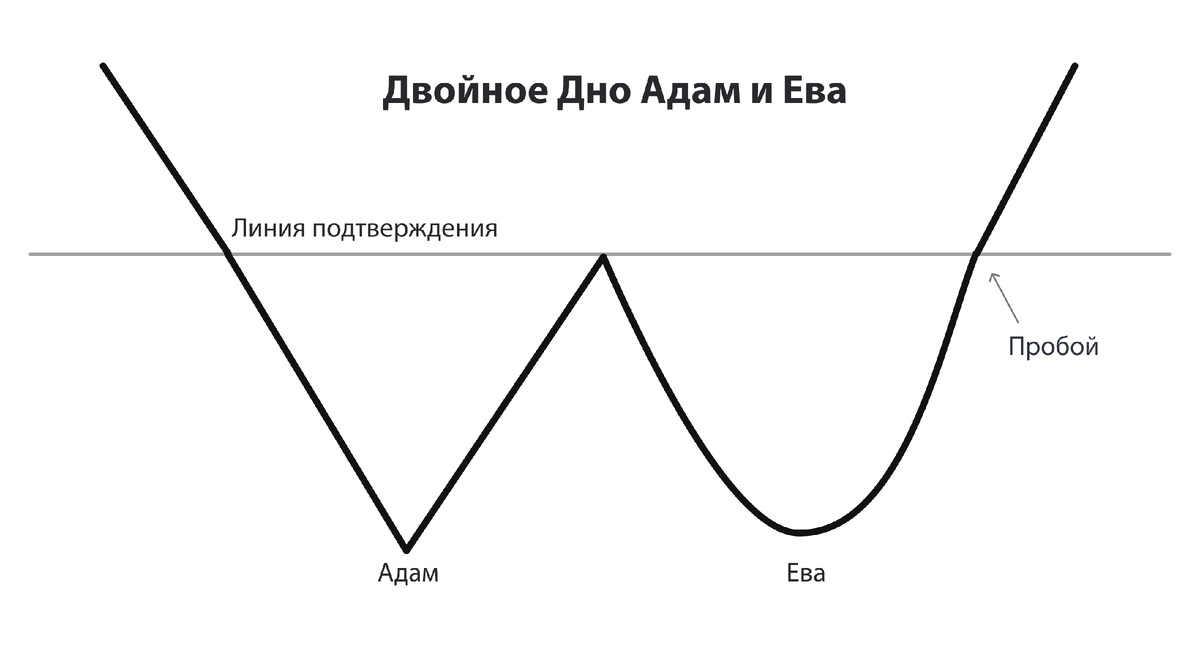 «Адам и Ева» или двойное дно «Адам и Ева» - фигура технического анализа, которая формируется в конце нисходящего тренда и обычно сигнализирует о его развороте. Она состоит из двух впадин – «Адама» и «Евы». ◽️Дно «Адама» – это V-образный минимум, который образуется в конце медвежьего тренда. Оно также может состоять из пары последовательных минимумов, при условии, что высота второго минимума меньше половины высоты первого. ◽️Дно «Евы» представляет собой закругленную впадину более широкого диапазона. Особые характеристики: 1. Если цена вырастет более чем на 10% между основаниями Адама и Евы, более вероятно, что паттерн отработает. 2. Если объем покупок вырастет на дне «Адама», более вероятно, что паттерн отработает. В то же время объем покупок должен уменьшиться от минимума «Адама» до минимума «Евы». 3. Чтобы окончательно подтвердить паттерн, цена должна вырасти выше максимума фигуры, образованного между впадинами «Адама» и «Евы». Торговые правила 1. Трейдеры проводят линию подтверждения