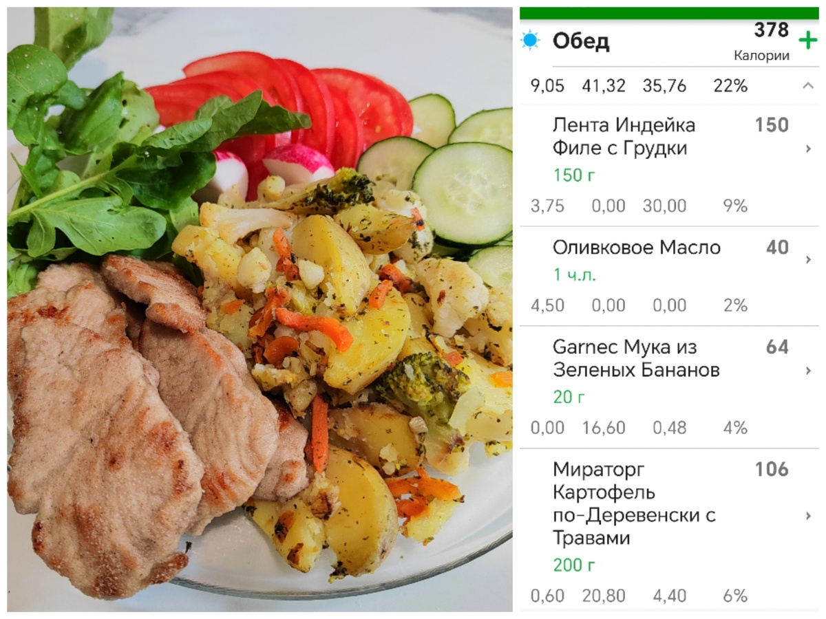 Сегодня на обед грудка индейки в банановой муке, овощи по деревенски 200 гр, помидор, огурец, редис, руккола, груша.