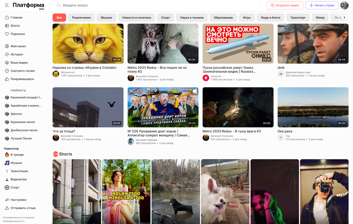 В России открылась копия Ютюба, скорее всего после того как заполнится вся Платформа, то Ютюб в стране закроют, как Инстаграм и прочие антироссийские соцсети. Ну, а что - на ютюбе много фейковой, вражеской информации, тем более наши клипы и передачи давно уже блокируют. Вон и айтюнс за ним далеко не ушел - не пропускает музыкальные релизы о войне, причем не только про СВО, но и афганской и чеченской тематики, только после непосредственного обращения в службу поддержки. Ютюб уже давно нарывался - прикрыл каналы Гоблина, Михалкова, Стаса "Ай как Просто" и других блогеров. Так нет же - они уже и за певцов взялись - и ютюб закрыл официальные каналы Газманова, Шамана, Лепса, Чичериной, Гагариной и Манучарова. Должны были и Расторгуева Николая закрыть (канал) да не посмели пока. Заходим на https://plvideo.ru и видим все как на ютюбе. Всё да не всё. Регимся через номер телефона - намного проще без всяких аккаунтов и емайлов. Творческая панель - Контент такая же. Загрузка сверху, стрим сверх