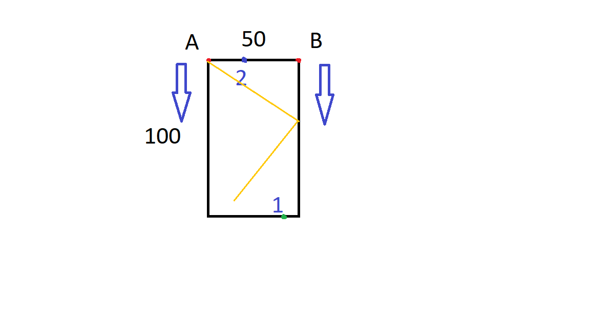 Итак, приготовьтесь, будет немного текста, но задача достаточно интересная. Двас студента технического ВУЗа решили потренироваться и оттестировать систему навигации и расчета траектории дрона. Для этого они решили стартануть из точек А и В соответственно. Встретившись в первый раз в точке 1 они развернулись и стартанули обратно до встречи в точке 2. Скорости движения студентов различны, но постоянны. На рисунке тот самый квадратный стадион с размерами в метрах. А что же дрон. У него стояла своя задача. Он стартанул из точки А и летел на перехват второму студента, просчитав место где они с ним пересекутся (скорости постоянны), после того как он (дрон) над ним на долю секунды завис, он стартует в сторону первого студента, до встречи с ним. После этого летит обратно ко второму студенту. Так получилось, что в точке 2 встретились студенты и дрон долетел до одного из них. Скорость дрона больше скорости каждого из студентов, но равна сумме их скоростей. Считаем, что все движения студентов