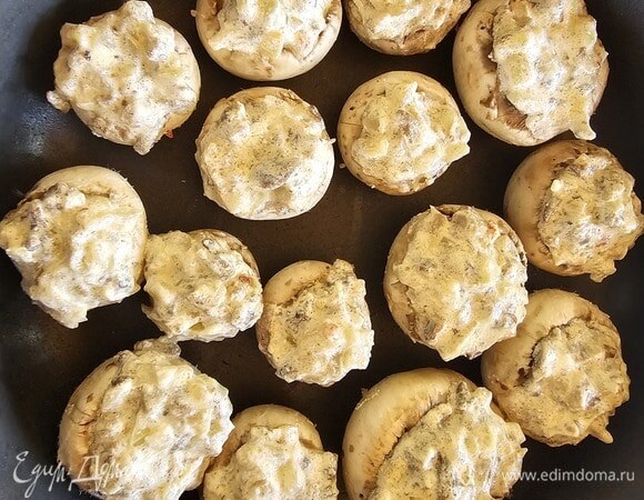 лук репчатый - 1шт. У шампиньонов выкрутить ножку. Если грибы большие, то выскрести ложкой внутреннюю часть с перепонками. Если шампиньоны маленькие, то немного срезать ножом нижнюю юбку гриба, чтобы потом было удобно фаршировать. Нарезать мелко ножки и перепонки от грибов, измельчить лук. Обжарить на сильном огне нарезанные грибы, добавить нарезаный лук и готовить до мягкости. Добавить сливки, поперечить, посолить, чтобы уровень соли был чуть выше среднего (так как будем фаршировать несоленые шляпки). Нафаршировать готовой начинкой шляпки. Поставить их запекаться в духовку при 200°C минут на 15–20. Или можно поставить в сковороде на плиту минут на 15, накрыв крышкой. Добавлять масло не надо, шампиньоны выделят достаточно влаги.