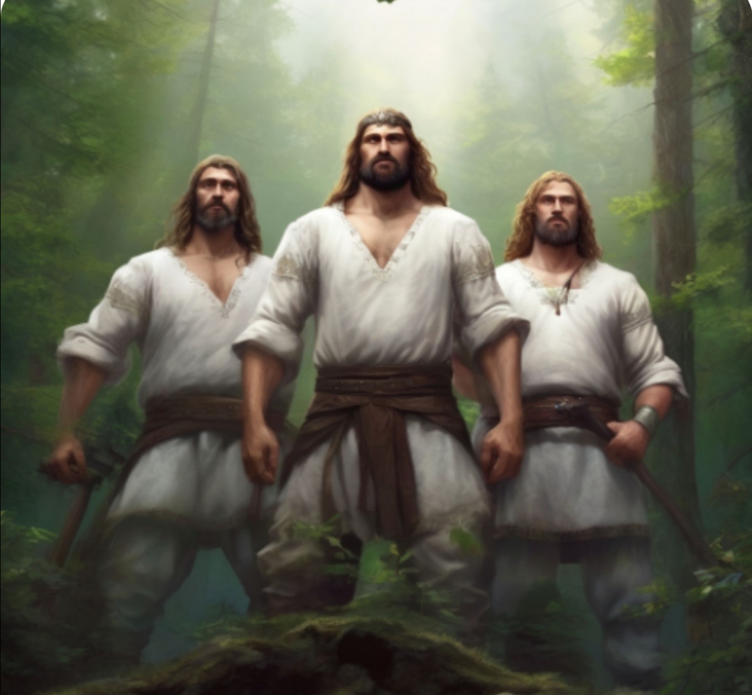 Там, над макушками деревьев возвышались три огромные мужские фигуры в старинных русских рубахах.