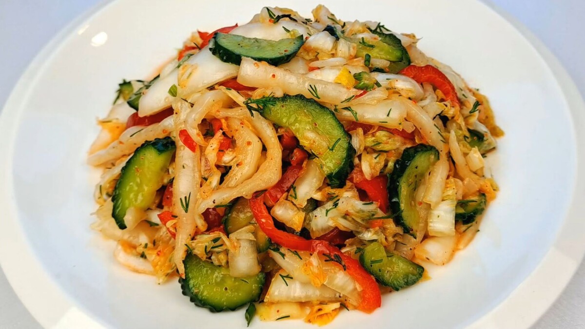 Предлагаем Вашему вниманию простой и вкусный рецепт - салата из пекинской капусты. Рецепт Капуста пекинская - 500 гр. Перец свежий - 120 гр. Огурцы - 200 гр. Чеснок - 2-3 зубчика Укроп - 4-5 веточек Соль - 0.5 ст.л. Сахар - 1/3 ст.л. Черный перец - 0.5 ч.л. Красный перец сухой молотый - 1 ч.л. Растительное масло - 2-3 ст.л. Уксус (70%) - 1/3 ст.л. СПОСОБ ПРИГОТОВЛЕНИЯ Пекинскую капусту режем соломкой. Огурцы режем полукружьями. Свежий перец режем соломкой. Укроп режем мелко. Вместо укропа можно взять кинзу. Чеснок пропускаем через чеснокодавилку или натираем на мелкой тёрке. В капусту с огурцами и перцем насыпаем половину столовой ложки соли. Перемешиваем и оставляем на полчаса, чтобы овощи дали сок. Прошло полчаса. С овощей выделился сок, сливаем его. Теперь добавляем в овощи: 1/3 столовой ложки сахара, половину чайной ложки черного перца, 1 чайную ложку острого красного перца, 2-3 столовые ложки растительного масла, 1/3 столовой ложки уксусной эссенции. Также добавляем зелен