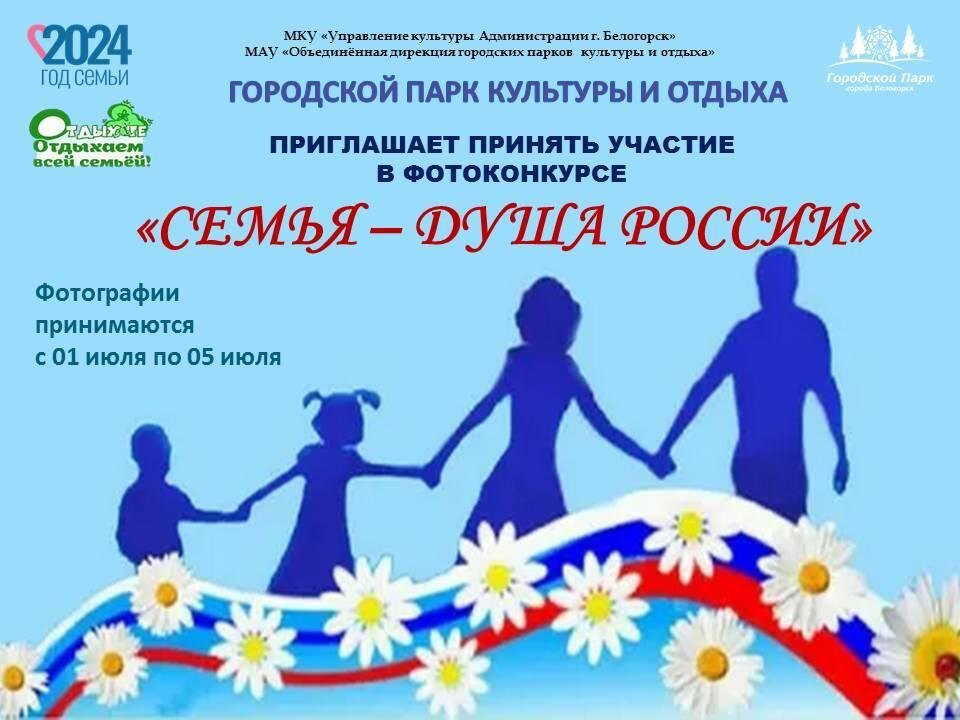 7 июля ко Дню семьи, любви и верности в горпарке Белогорска состоится концертно-развлекательная программа «Любовью дорожить умейте». Мероприятие организовано в рамках проекта «Отдыхайте» и в рамках Года семьи, который объявлен в 2024 году Указом президента Владимира Путина. В этот день для жителей и гостей города выступят творческие коллективы и солисты города, пройдут увлекательные активности, а также состоится фотовыставка «Семья – душа России». Своими семейными фотографиями для нее приглашают поделиться белогорцев — горпарк объявил одноименный фотоконкурс. — Конкурс «Семья – душа России» проводится по номинациям: «Моя семья. Счастливые моменты», «Мой отец - мой герой» (фотографии отцов с детьми), «Счастье быть мамой» (фотографии мам с детьми); «Моя семья – моё богатство» (совместное фото всех членов семьи. Приветствуется как можно больше родных людей), — рассказала замдиректора горпарка по культурно-массовой работе Оксана Черкасова. — Фотографии принимаются до 15 часов 5 июля. Фотор