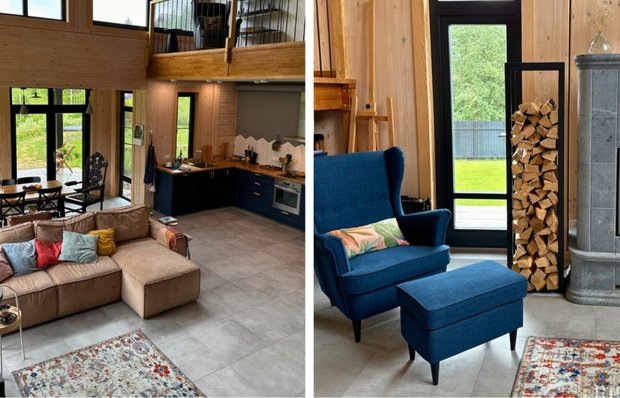 Дизайн: Елена Доброчинская Первый этаж отвели под просторную общую территорию кухни-гостиной со вторым светом и настоящим камином. Также здесь есть сухая сауна и гостевой санузел. На втором этаже — три спальни, кабинет и еще один санузел. Кухню обустроили в нише. Это стандартный гарнитур из готовых модулей с большим количеством мест для хранения. Фишкой стал фартук из белой плитки кабанчик в раскладке «елочка». Узор смотрится нетривиально и выступает