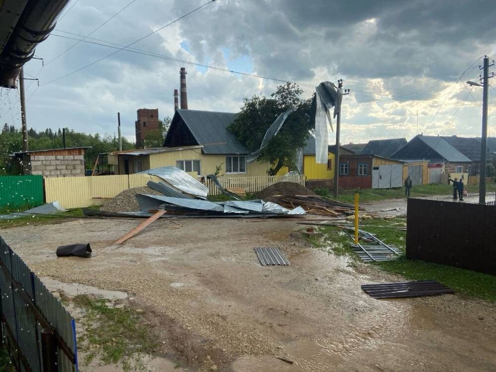 Шквальный ветер повредил крыши домов и хозяйственных построек. На опубликованных в соцсетях фотографиях видно металлические листы, сорванные с крыш. Металлические листы также оказались на проводах, деревьях и на дороге.
