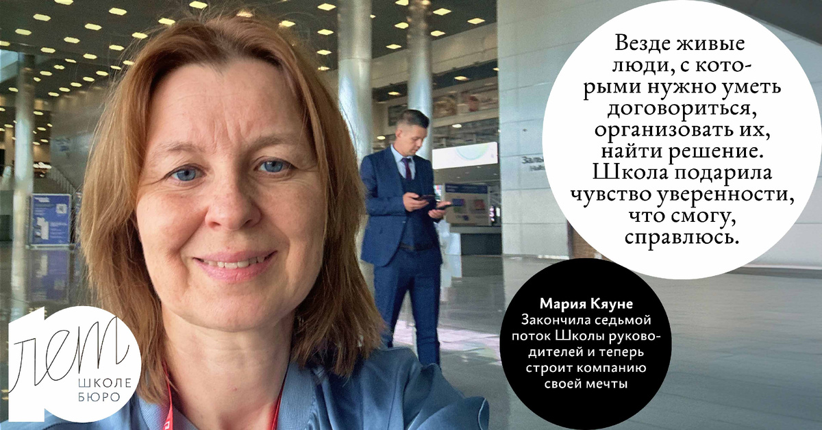 Мария Кяуне закончила седьмой поток Школы руководителей и теперь строит компанию своей мечты. Мария рассказывает свою историю: «Привет, я Маша. Пришла в Школу бюро совсем из другой жизни. Работала на иностранном производстве, руководила двумя небольшими заводиками. После сорока лет появилось ощущение тупика, не‑развития, топтания на месте. Посоветовалась с детьми и решилась. Учиться было трудно. Всё новое, незнакомое. Мозги скрипели от натуги. Но сразу же пришла и радость, что делаю что‑то совершенно для меня новое. Главное же — поняла, что менеджмент в айти во многом похож на то, что я знаю и умею. Что мой предыдущий опыт работает и здесь. Везде живые люди, с которыми нужно уметь договориться, организовать их, найти решение. Школа подарила мне чувство уверенности, что смогу, справлюсь. Так сложилось, что я не ушла с той работы. Теперь думаю, что подпиталась энергией школы, вдохновилась, начала внедрять новые знания в нашу суровую производственную реальность. А потом наступил 22‑й год,