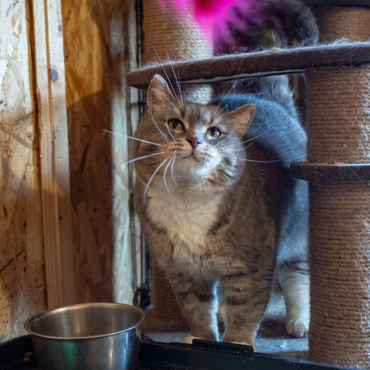 Ежевика, юная кошка (около 2 лет) в серо-розовой плюшевой шубке. Быстро привыкает к человеку, в меру навязчивая и пока не любит сидеть на ручках.