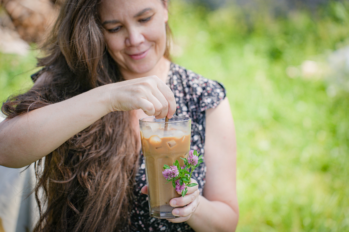 Что-то захотелось айс-латте. А до поездки в Москву ещё две недели. Готовлю сама с сиропом из клевера. Сироп из клевера – это как "мёд" из одуванчиков. Пахнет клевером, мёдом, цветущим лугом. У цветков беру только лепестки, без зелёной части. Их очень просто и быстро можно обрезать ножницами. Кто не хочет заморачиваться, может прямо с зелёным с цветоложе брать. Правда немного может горчить. Цветки перед тем, как обрезать, минут на 10 замачиваю в подсоленной воде чтобы жучки выползли. Если есть жучки. В этом году совсем нет жучков, а в прошлом много было.
