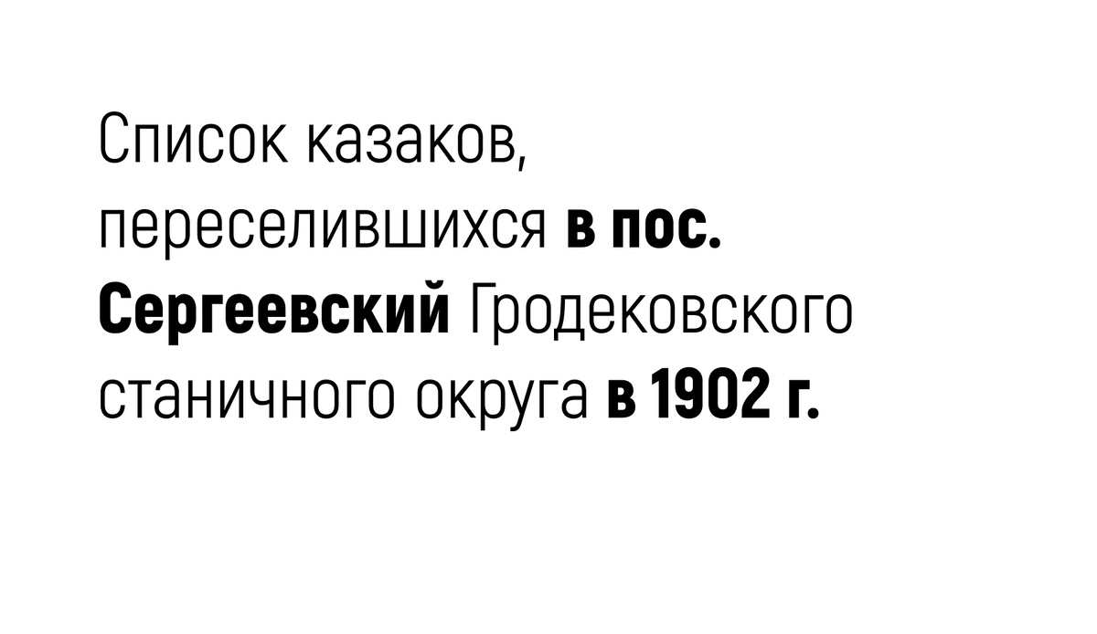 Ниже привожу список семей казаков, переселившихся в поселок Сергеевский (Сергеевка (1899 г.), Сергиевское) Гродековского станичного округа (современный Пограничный район) в 1902 г. с указанием ФИО и возраста главы семьи, членов семьи и их возраст, откуда прибыли. Оренбургского войска