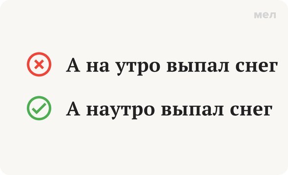 Продолжаем путешествовать по удивительным мирам наречий и наречных сочетаний, где исключения есть не только из правил, но и из самих исключений. Всё очень запутанно. Но мы всё равно попытаемся разобраться. «Наутро» может быть и наречием, и сочетанием существительного с предлогом. Наречие — это когда вот так: А существительное с предлогом — вот так: Для того чтобы понять, с чем мы имеем дело и как правильно это писать, нужно подставить к слову «утро» вопрос. В «Грамотности» мы часто рассказываем про хитрые правила наречий, наречных сочетаний и существительных с предлогами, которые постоянно притворяются друг другом, врут, петляют и меняют внешность. Чтобы научиться разбираться, кто из них кто и почему, почитайте, например, вот эту подборку, узнаете много нового. Больше полезных карточек о русском языке — в «Грамотности» на «Меле» в Telegram. Подписывайтесь, чтобы говорить и писать правильно. Иллюстрация: Vectorium / Shutterstock / Fotodom