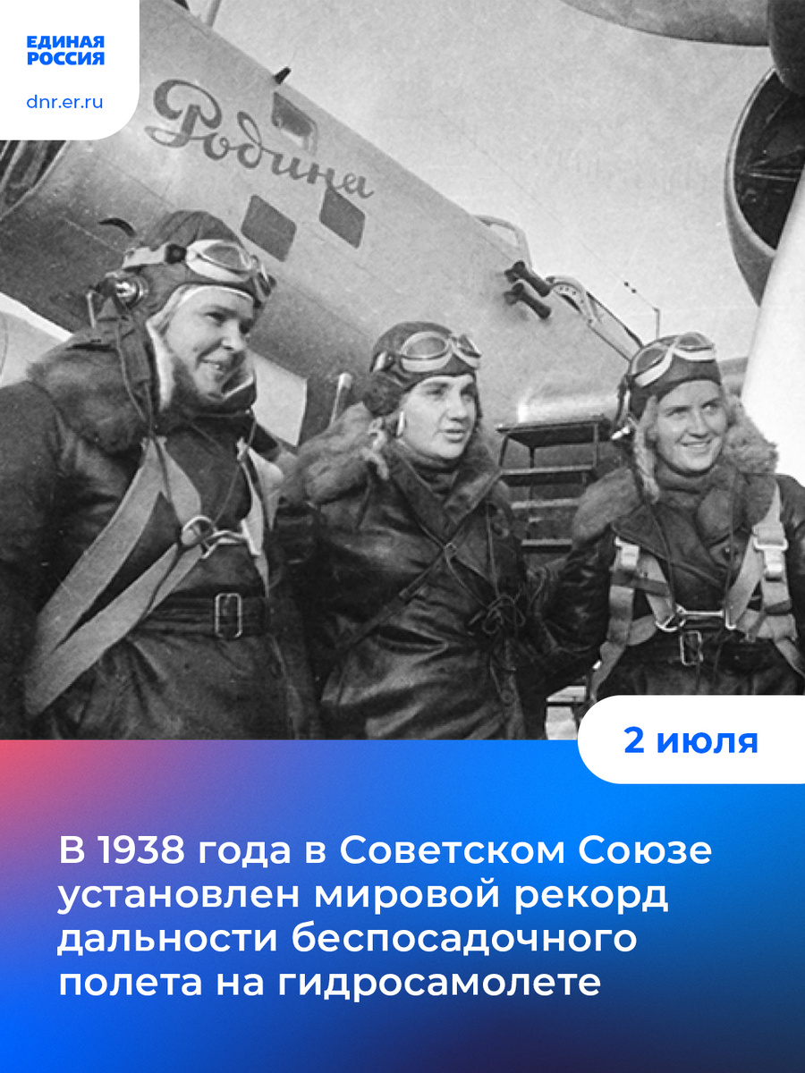 2 июля 1938 года в Советском Союзе был установлен мировой рекорд дальности беспосадочного полета на гидросамолете. Его установили три советские военные летчицы: Полина Осипенко, Вера Ломако и Марина Раскова. Маршрут пролегал из Севастополя в Архангельск и проходил через Киев и Новгород. Общая дальность перелета составила 2 416 километров, которые советские летчицы преодолели за десять с половиной часов.