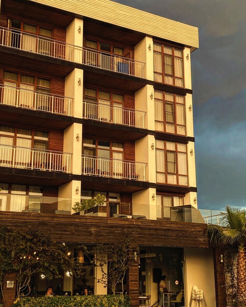.... Такси остановилось среди каких-то строек - и мы увидели вход в отель. Перед входом скульптурная композиция с фонтанчиком. Холл как-то не поражает роскошью - диван и стойка рецепшна. На рецепшне все работники очень милые, с грамотной речью. Взяли документы, поинтересовались, будем ли мы приветственный напиток. Я аж глазки закатила, представив запотевший бокал с пенящимся игристым. Но все намного оригинальнее - приветственным напитком оказался компот из кизила. Кстати, холодный и очень вкусный. Оформили нас очень быстро, проводили в номер, все показали, все объяснили. Номер очень приличный, двухспальная кровать, дополнительное место (кресло-кровать), все, как положено - халаты, полотенца, сейф, фен. (Кстати, очень понравилось, что есть халаты разных размеров - очень мило выглядели малыши возле бассейна в маленьких отельных халатиках). Балкон с мебелью, вид на горы и кусочек моря. Вода горячая без отключений, свет тоже. Единственное замечание - очень скудное наполнение мыльно-рыльн