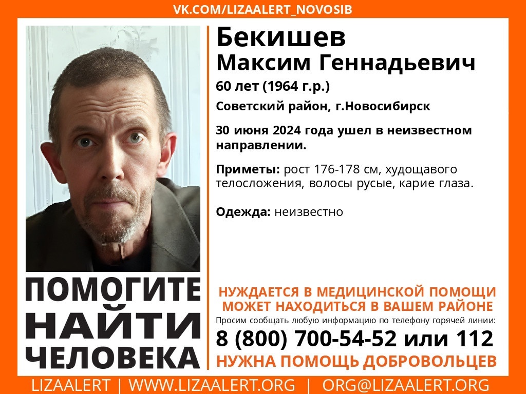 В Новосибирске волонтеры ищут 60-летнего Максима Бекешева, который 30 июня ушел в неизвестном направлении и до сих пор не вернулся. В последний раз мужчину видели в Советском районе, сообщает пресс-служба поисково-спасательного отряда «ЛизаАлерт» по региону. Волонтеры просят помощи в поисках мужчины и подчеркивают, что он нуждается в медицинской помощи. «Рост Максима — 176 сантиметров, худощавое телосложение, карие глаза, волосы русые», — пишут активисты. При этом в какой одежде ушел мужчина, неизвестно. Всех, кто владеет какой-либо информацией о местонахождении новосибирца, просят сообщить по телефону горячей линии отряда «ЛизаАлерт» 8-800-700-54-52 или по номеру 112. Ранее в Мошковском районе пропал 55-летний Юрий Клюкин Андрей Иванов