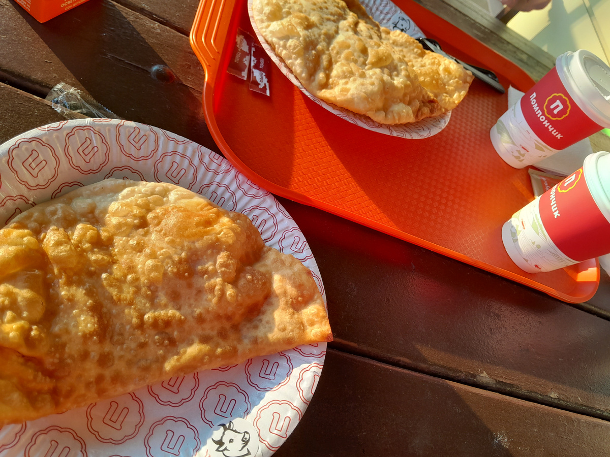 Захотелось тут двойняшкиной маме пончиков. Ну раз в год-то можно 😉, - подумала я. Никаких проблем, Помпончик под боком. Далековато идти, но норму шагов всё равно нахаживать надо:) Ну и потом Помпончик у нас традиционно раз в год на трассе М4 по дороге на юг. Раз в этом году мы изменили направление, то в Помпончик можно просто так сходить. Сейчас получится какой-то больно отрицательный отзыв на Помпончик, но ничего не могу поделать. Пошли. Хоть коляска и стала у нас Уже, чем была, но в Помпончике настолько узкие двери, что зайти было нереально. Как и сложить - занести - разложить коляску. Решили, что обойдёмся летней верандой. Дело было вечером, на веранде комфортно, не холодно и не жарко. Отправили мужа за пончиками/чебуреками, а сами остались ждать снаружи. Не знаю, как внутри, но снаружи столы все грязные, пыльные. Видимо, там никто не убирается. Ну или делают это крайне редко. Заказ собирают долго, мы с двойняшками замучались ждать (Елизавета предпочла остаться с друзьями, но дос