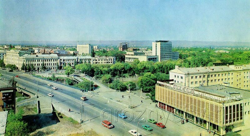 Слева мост через Сунжу, и проспект Победы превращается в проспект Ленина. У левого края снимка здание Совмина, правее виден новый главный корпус Грозненского нефтяного института. В правом нижнем углу магазин и ресторан "Океан" уже на проспекте Ленина. Все эти кварталы сейчас полностью уничтожены: на том берегу реки площадь Кадырова с гигантской мечетью и исламским университетом на месте ГНИ. Вместо "Океана" и соседних зданий – "Грозный-Сити".