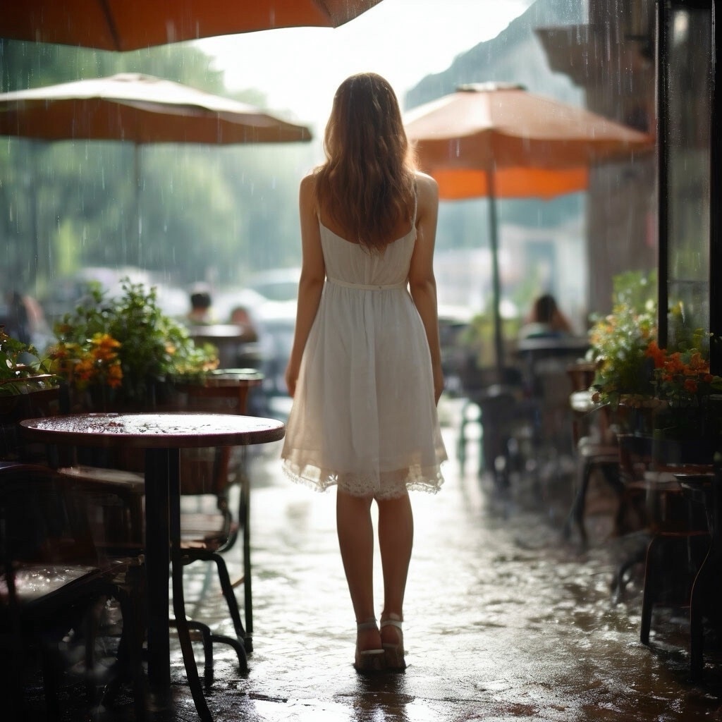 Прогулка под дождем Сбивая летнюю жару, Под гром в вершинах туч. На город реками в пару, Пролился с неба ключ. Гуляли мы с тобой по парку, Забыв про гром и дождь. Нам было вместе очень жарко, Мы шли все дальше прочь. Нам повстречалось на аллее, Уютное летнее кафе. Где запах кофе не жалеет, Зовет и манит, как во сне. За чашкой кофе наблюдали, Политру красок от дождей, То свет сквозь тучу проникает, То потемнеет, как на дне. На небе яркими цветами, Нависла радуга дугой. А солнце в небе с облаками, Залило горизонт зарей.
