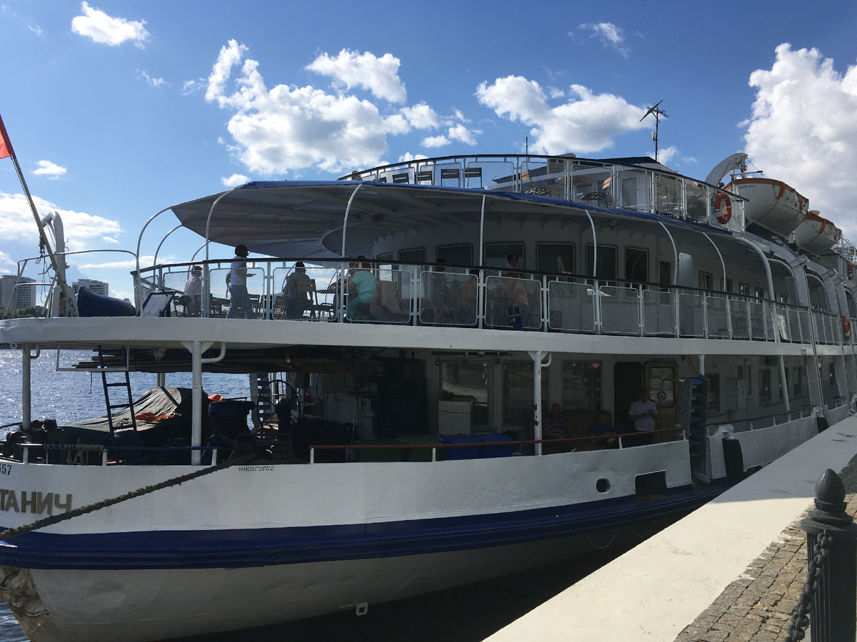 Когда наш "Михаил Танич" подходил к Северному речному вокзалу, там у причалов стояло несколько прогулочных теплоходов, и ещё больше - круизных. Все причалы были заняты, так что швартоваться нам пришлось к другому круизному теплоходу - с гордым названием "Президент", который стоял у того же третьего причала, от которого мы отправлялись в круиз три дня назад.