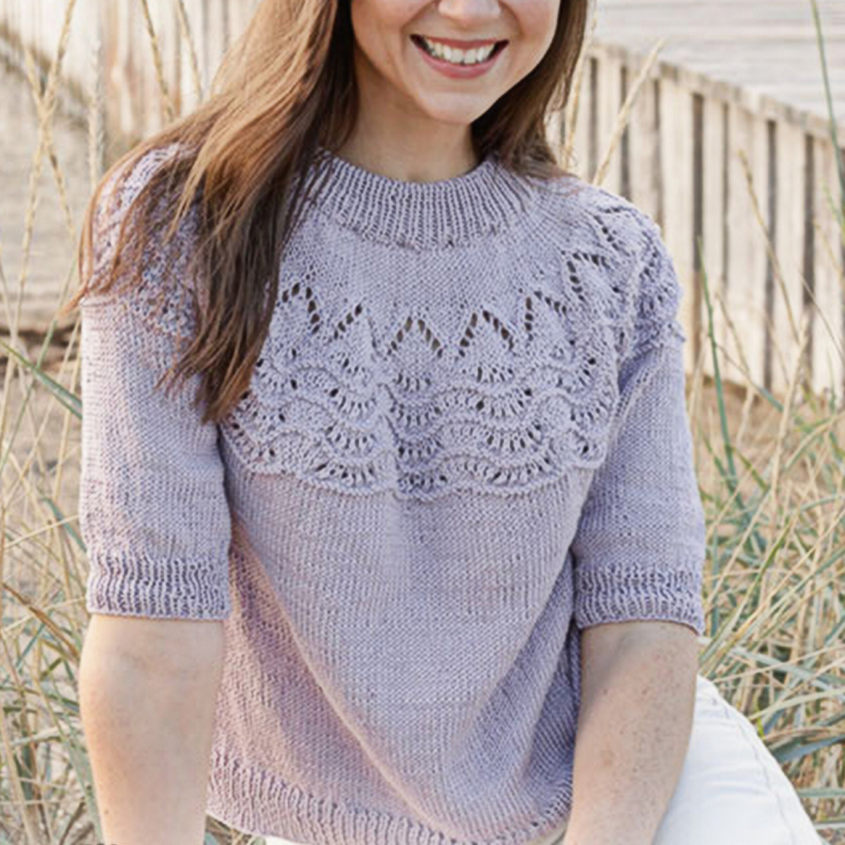 Лавандово-серый джемпер Hope Bay от Drops Design. Красивая ажурная кокетка с рельефными волнами, двойной ворот и рукавчики выше локтя.